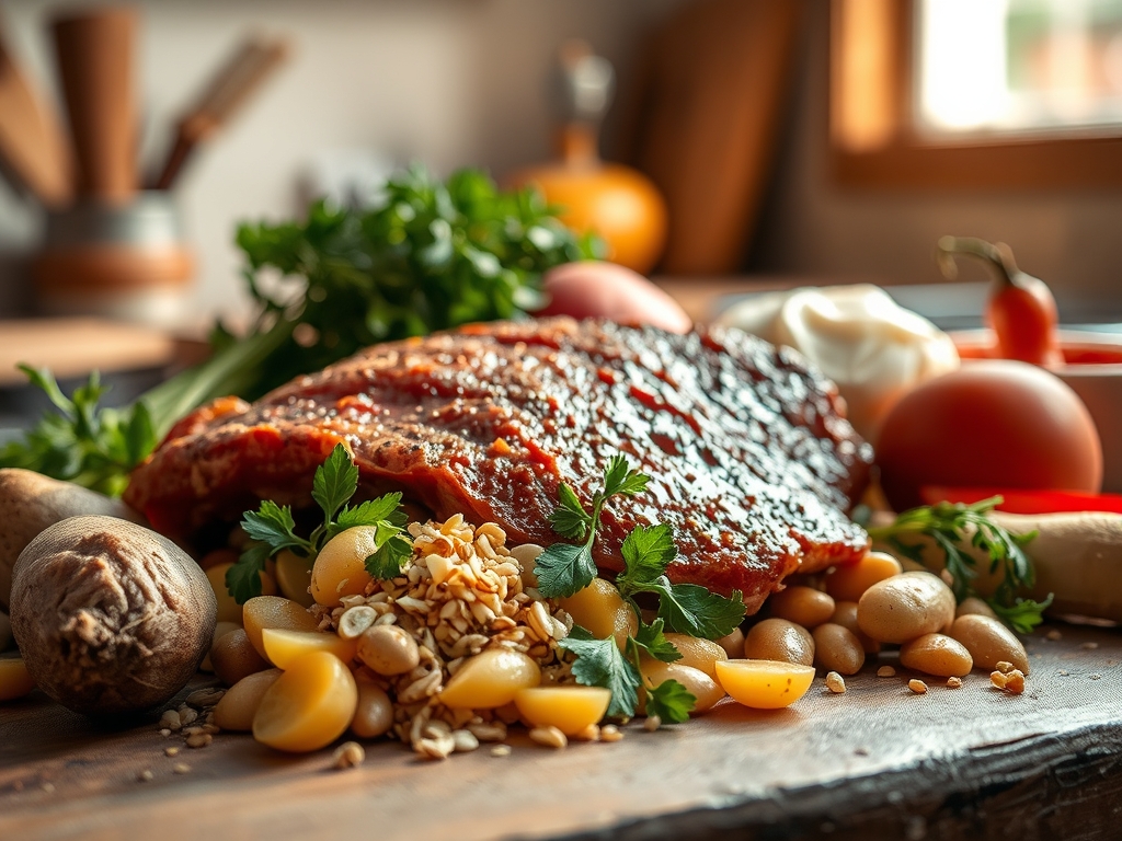 O aroma que invade a casa numa tarde de domingo nao e apenas cheiro a comida; e uma promessa de conforto que se materializa lentamente. Quando falamos de carne assada com batatas, estamos a entrar no reino da alquimia culinaria, onde o colagenio duro se transforma em seda e o amido da batata se torna um veiculo para a gordura mais rica. Nao e apenas um prato; e um evento de paciencia. Para conseguirmos aquela textura que se desfaz ao toque do garfo, precisamos de entender que o calor e o nosso melhor amigo, mas tambem o nosso maior desafio. Prepare o seu tacho de fundo grosso e afie as facas, porque hoje vamos elevar este classico a um nivel de perfeicao tecnica que deixaria qualquer chef de estrela Michelin orgulhoso, mantendo sempre aquele calor humano que so uma cozinha cheia de amigos proporciona.