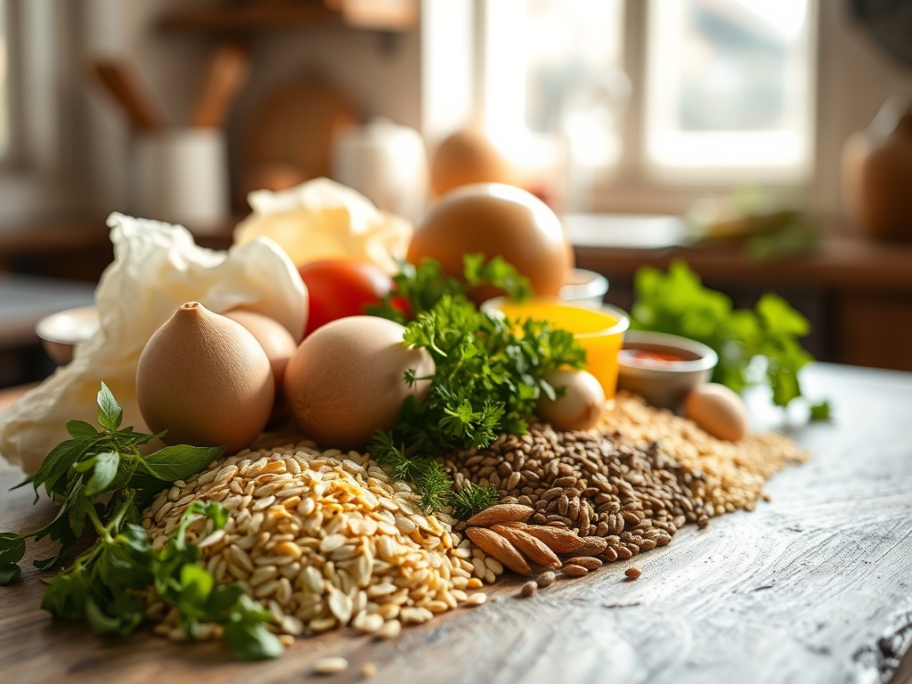 Os ovos devem ser biológicos ou de galinhas felizes, pois a cor da gema influencia diretamente a estética final. A cebolinha (ou cebolo) traz a nota herbácea e o frescor necessário para cortar a gordura da carne. Utilizem uma balança digital para precisão, pois a proporção entre gordura e farinha é o que define o sucesso da textura.
